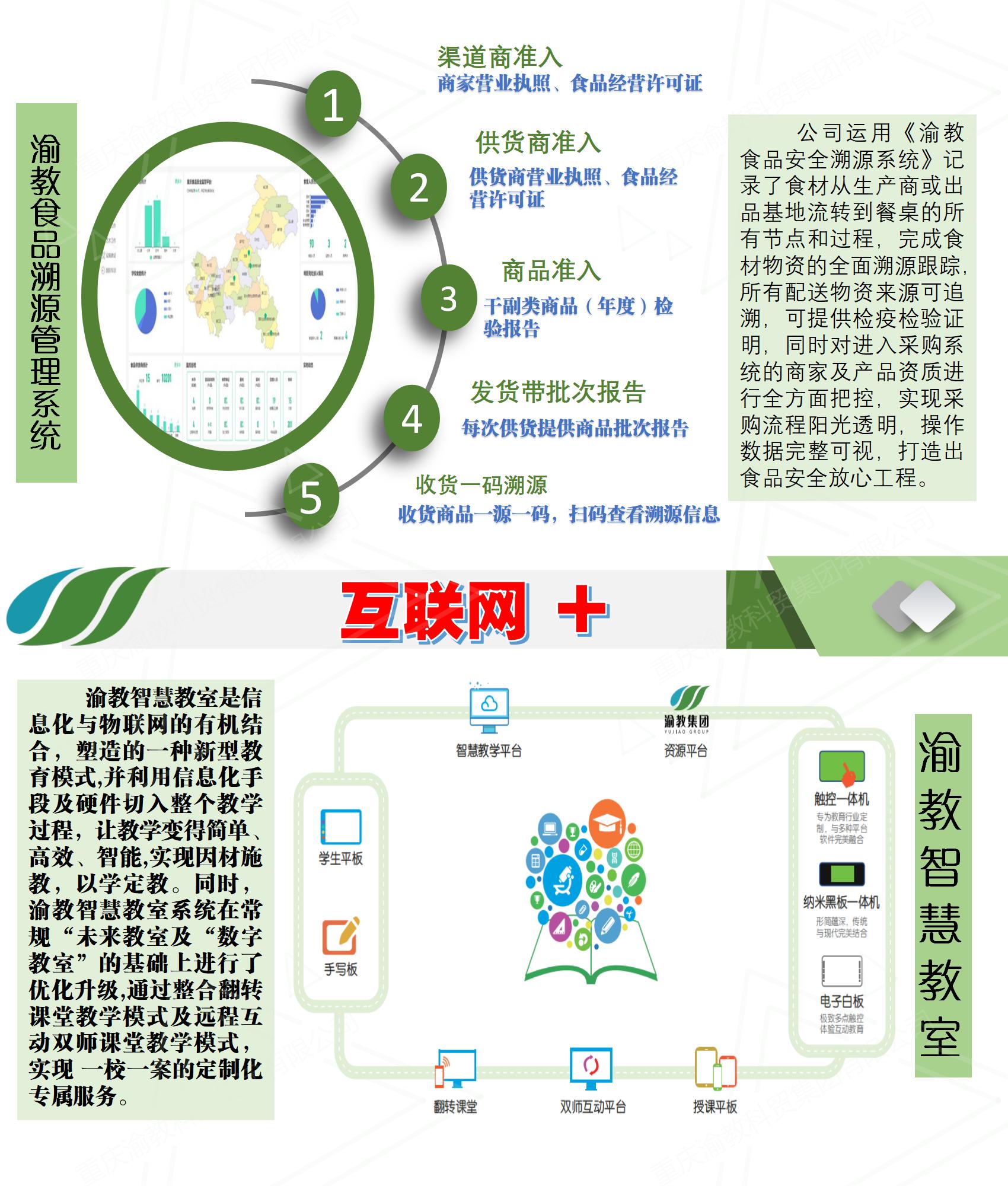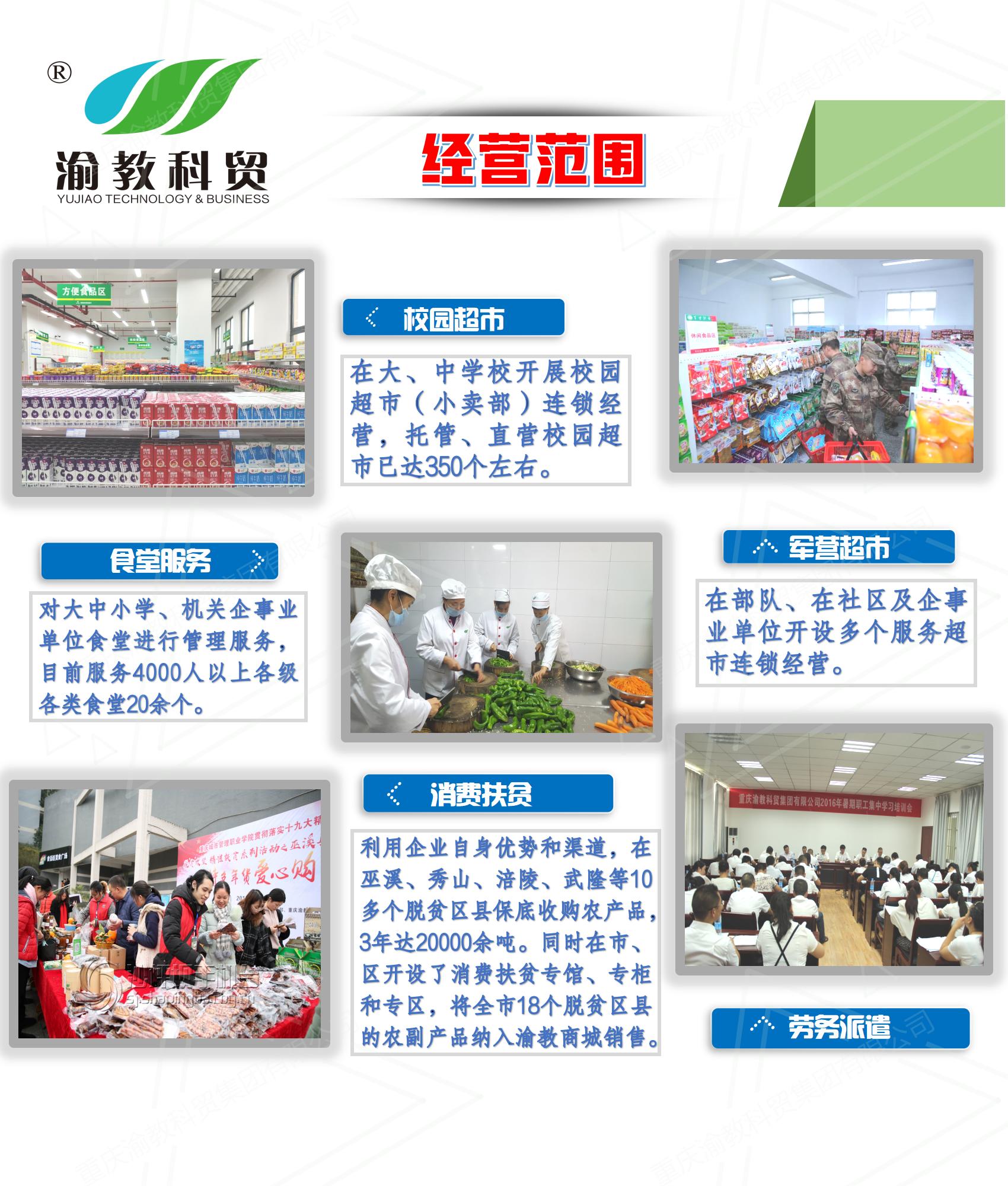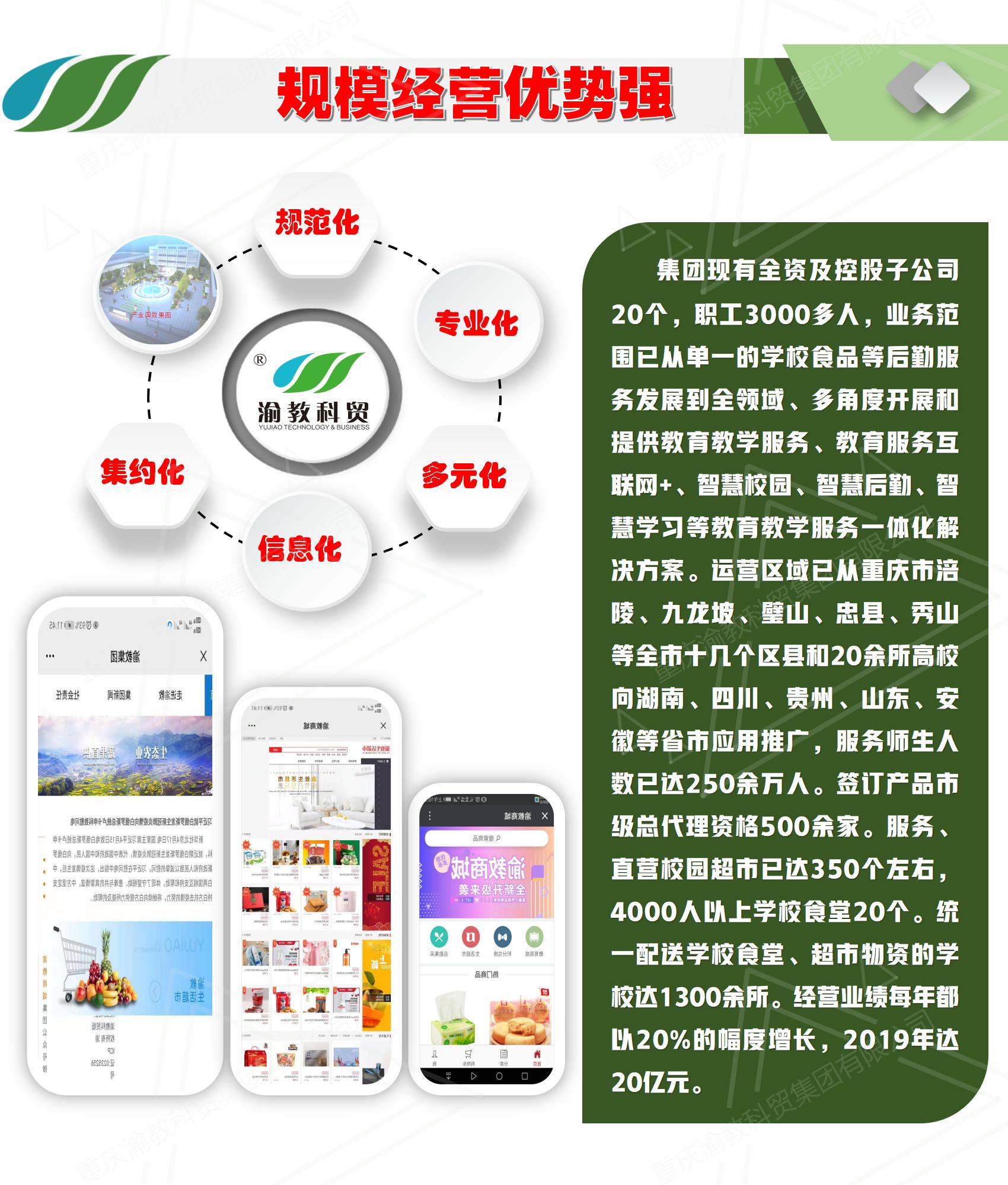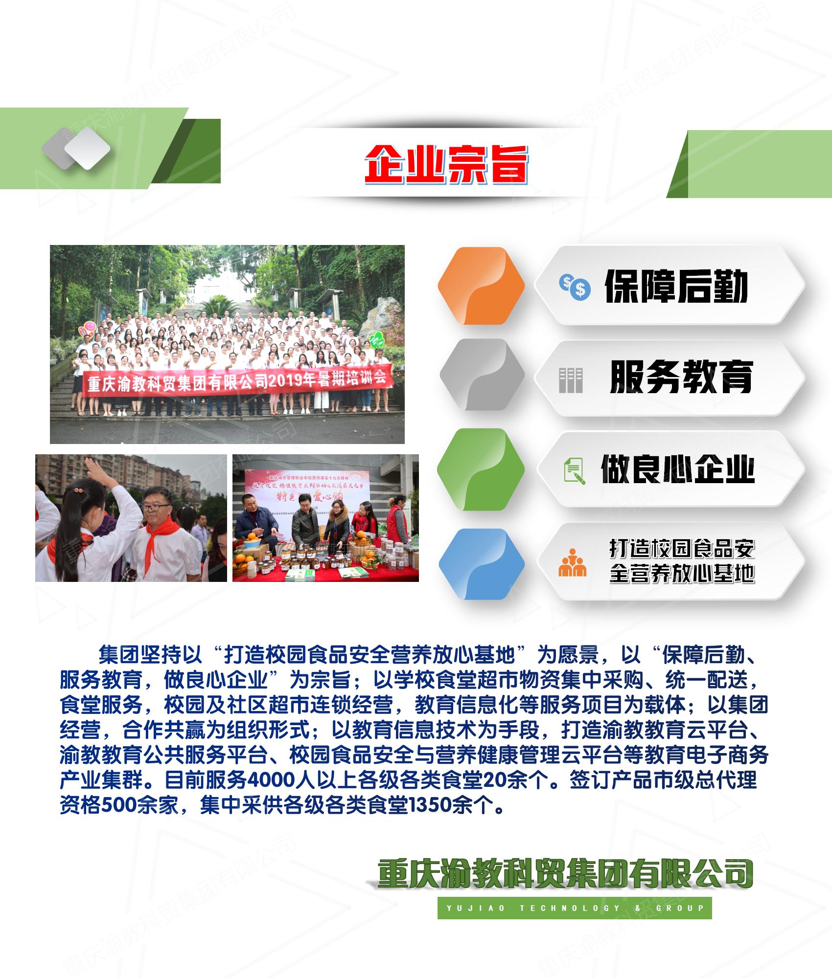 重慶渝教科貿集團有限公司是由市內(nei) 部分區縣教育後勤服務企業(ye) 聯合組建,專(zhuan) 業(ye) 從(cong) 事教育教學服務的市級綜合性教育服務集團,是重慶市服務行業(ye) 100強企業(ye) 、重慶市教育後勤服務龍頭企業(ye) 、涪陵區商貿行業(ye) 龍頭企業(ye) 、涪陵區商貿十強企業(ye) 、重合同守信譽企業(ye) 、消費扶貧示範企業(ye) 、電商扶貧示範企業(ye) 、安全工作先進企業(ye) 、A級納稅企業(ye) 、AAA信用企業(ye) ,是中國商務信用聯盟成員單位、中國教育裝備行業(ye) 協會(hui) 會(hui) 員單位、重慶教育裝備協會(hui) 副會(hui) 長單位、重慶市企業(ye) 聯合協會(hui) 和重慶市工業(ye) 經濟聯合會(hui) 常務理事單位。集團堅持以“打造校園食品安全營養(yang) 放心基地”為(wei) 願景,以“保障後勤、服務教育,做良心企業(ye) ”為(wei) 宗旨;以學校食堂超市物資集中采購、統一配送,食堂服務,校園及社區超市連鎖經營,教育信息化等服務項目為(wei) 載體(ti) ;以集團經營,合作共贏為(wei) 組織形式;以教育信息技術為(wei) 手段,打造渝教教育雲(yun) 平台、渝教教育公共服務平台、校園食品安全與(yu) 營養(yang) 健康管理雲(yun) 平台等教育電子商務產(chan) 業(ye) 集群。