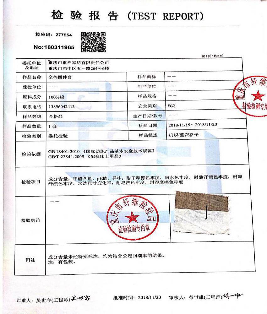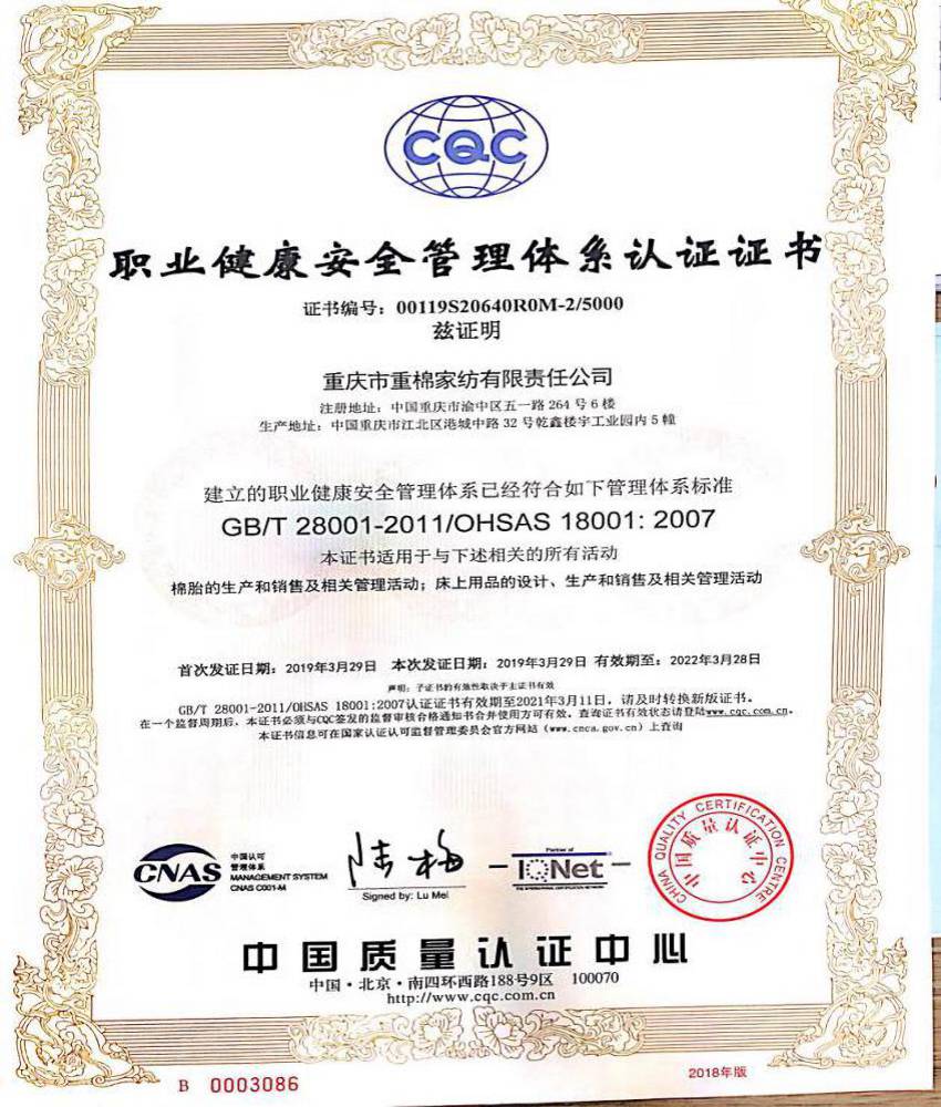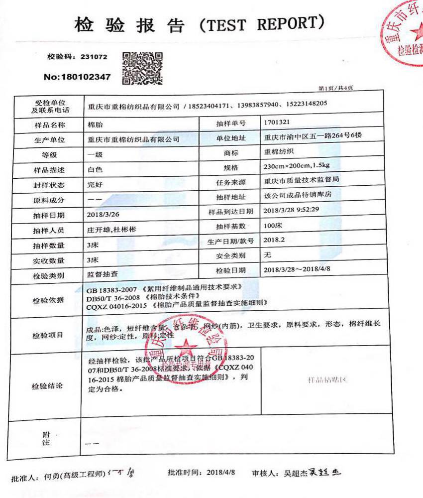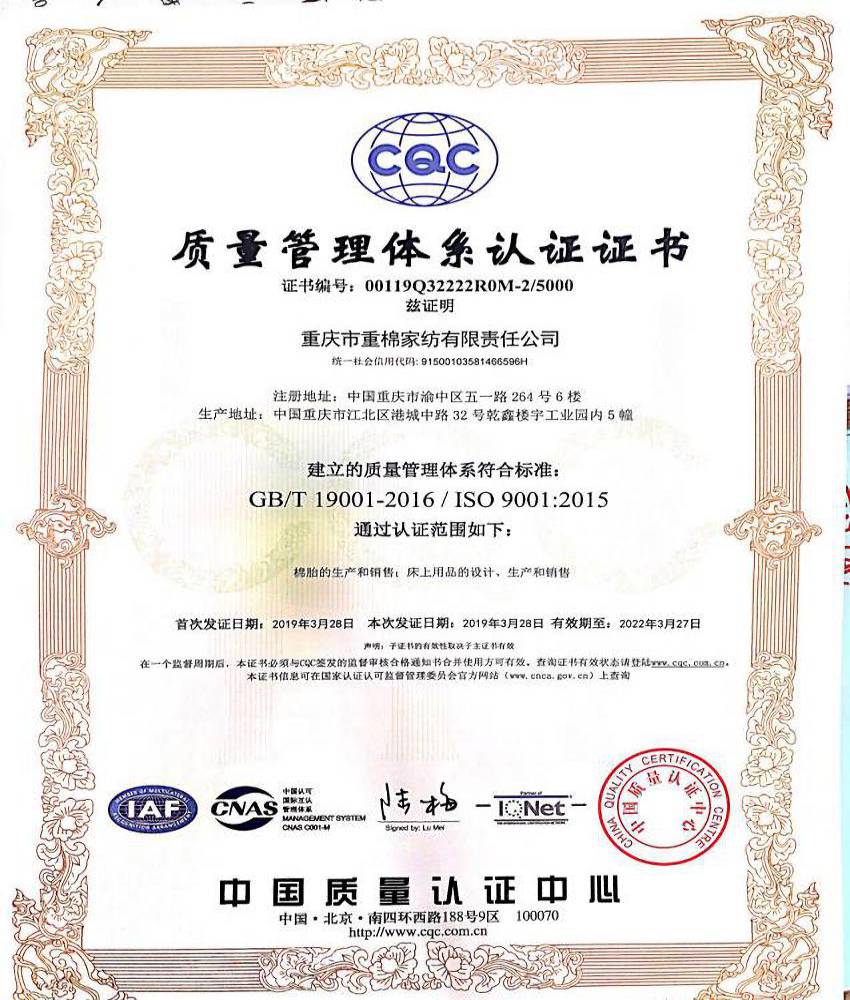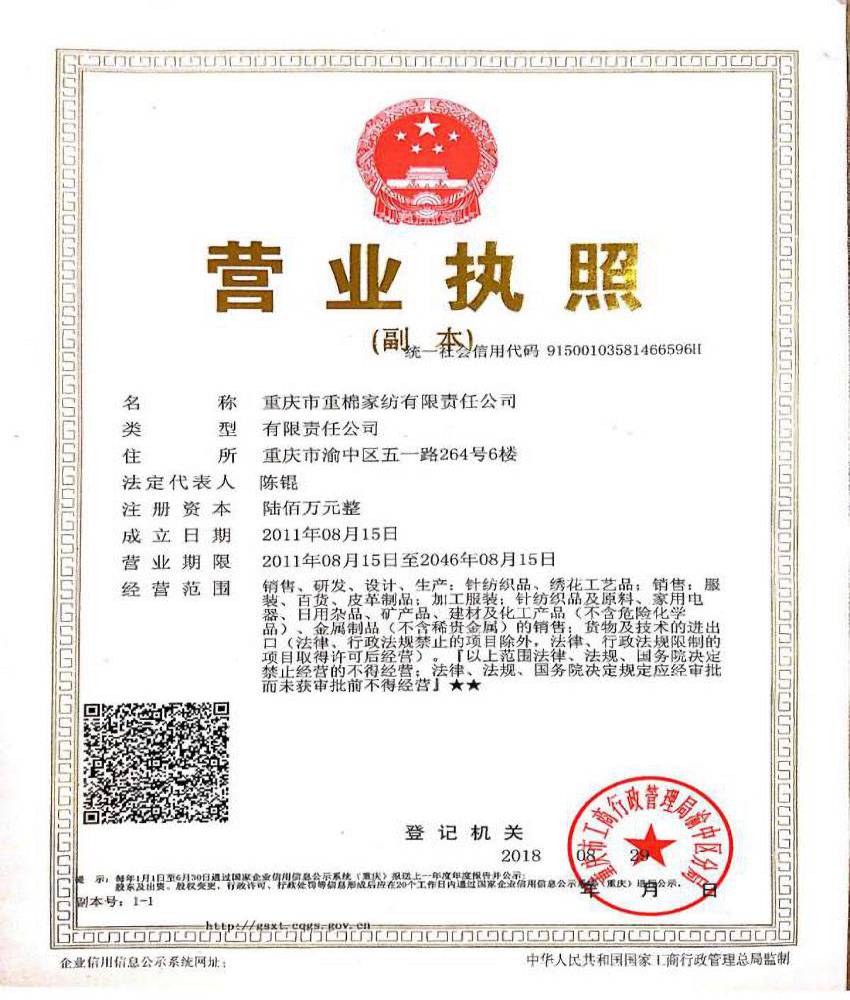 重慶市重棉家紡有限責任公司(以下簡稱公司)是重慶市棉麻集團有限公司下屬企業(ye) ,注冊(ce) 資本600萬(wan) 元,主要從(cong) 事銷售、研發、設計、生產(chan) 床上用品及針紡織品等業(ye) 務,是擁有市纖維檢驗局頒發的 “絮用纖維製品生產(chan) 加工企業(ye) 質量保證能力資格證書(shu) ”的生產(chan) 企業(ye) 。 公司加工生產(chan) 廠,位於(yu) 江北區港城中路32號乾鑫工業(ye) 園,該廠初創於(yu) 1956年,於(yu) 2012年搬遷改造升級後,現擁有市內(nei) 最先進的全套棉絮機械化自動流水線生產(chan) 設備,擁有豐(feng) 富的技術和管理人才。 公司生產(chan) 過程嚴(yan) 格執行國家標準,生產(chan) 的“重棉家紡”牌、“迪絲(si) 蘭(lan) ”牌優(you) 質棉絮及係列床上用品。 公司熱衷公益的形象已深入人心,深受社會(hui) 各界及群眾(zhong) 的好評。