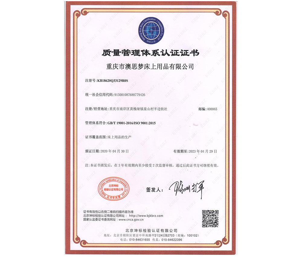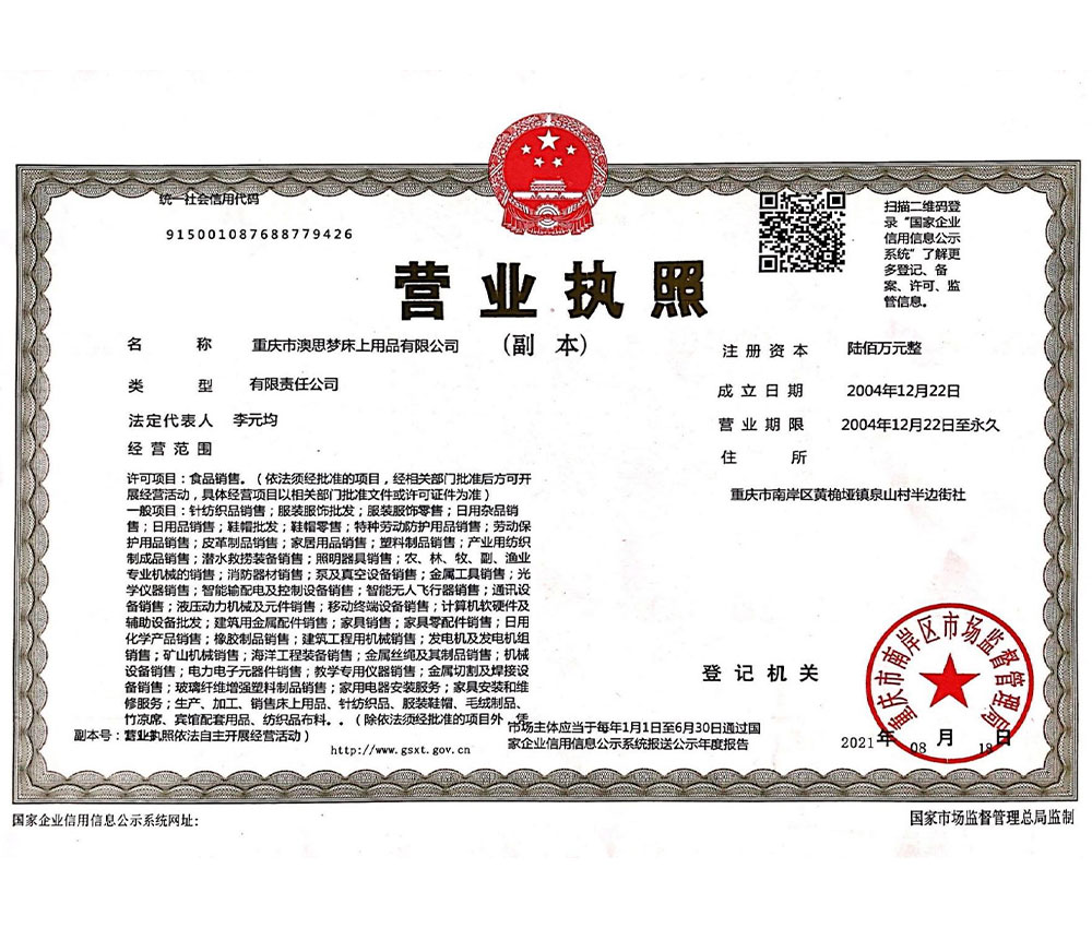 重慶市澳思夢床上用品有限公司,是一家專(zhuan) 業(ye) 從(cong) 事床上用品設計、生產(chan) 、銷售為(wei) 一體(ti) 的現代化企業(ye) 。 公司是一家專(zhuan) 業(ye) 從(cong) 事床上用品設計、生產(chan) 、銷售的現代化企業(ye) 。企業(ye) 現占地13畝(mu) ,房屋建築麵積10000平方米。企業(ye) 成立於(yu) 2004年,現位於(yu) 西南地區首個(ge) 經濟技術開發區——重慶市(南坪)經濟技術開發區,信息發達,交通十分便利。 本公司已經通過 ISO9001國際質量管理體(ti) 係認證,ISO14001環境管理體(ti) 係認證,ISO45001職業(ye) 健康管理體(ti) 係認證。現在,澳思夢的綜合實力在重慶家紡行業(ye) 中已是名列前矛。 企業(ye) 成立十年來澳思夢人一直努力不懈,不斷開拓,進取,企業(ye) 規模、實力節節攀升。現在,企業(ye) 已擁有價(jia) 值超過百萬(wan) 的機器設備等固定資產(chan) 。現在,企業(ye) 已擁有價(jia) 值超過百萬(wan) 的機器設備等固定資產(chan) 。其中包括目前重慶 最先進的機器流水線。澳思夢人深知質量是產(chan) 品的生命,因此,企業(ye) 在不斷提高硬件水平的同時還積極改進、完善生產(chan) 工藝,加強員工技能培訓,以 此提高產(chan) 品質量。澳思夢的產(chan) 品每年都經重慶市質監部門抽檢合格,並受到越來越多消費者和經銷商的讚揚,樹立了良好的品牌形象。 澳思夢在消費者的青睞下,不斷發展壯大。在成長的過程中,我們(men) 已經確定了自己的目標是成為(wei) 重慶家紡行業(ye) 的領先者;成為(wei) 中國家紡界的卓越企業(ye) ,開拓全國甚至海外市場。在市場競爭(zheng) 日益激 烈的今天,我們(men) 深知隻有不斷的創新才能為(wei) 顧客創造價(jia) 值,為(wei) 企業(ye) 求得發展。為(wei) 了回報消費者,達成企業(ye) 戰略目標,企業(ye) 已經製定出了詳盡務實的發展計劃,並且已 經著手引進先進的現代管理製度,提高員工素質,培養(yang) 企業(ye) 後備人才。並計劃運用最新計算機管理軟件(ERP)輔助管理。 在企業(ye) 發展過程中,我們(men) 將秉承"至真,至誠,至信"的經營理念,堅持以人為(wei) 本,以市場為(wei) 中心,"想客戶之所想"。為(wei) 我們(men) 的客戶創造價(jia) 值,為(wei) 把澳思夢床上用品有限公司發展成為(wei) 全國卓越的家紡企業(ye) 而奮鬥不已! 企業(ye) 目標: 成為(wei) 重慶家紡行業(ye) 的領先者,成為(wei) 中國家紡界中的卓越企業(ye) 。 企業(ye) 精神: 勤奮務實 誌存高遠 開拓創新 經營信念: 至真 至誠 至信 公司質量方針:誠信為(wei) 本、持續改進。滿足顧客、創建美好生活。 聯係人(公司):023-62482555 企業圖片 |