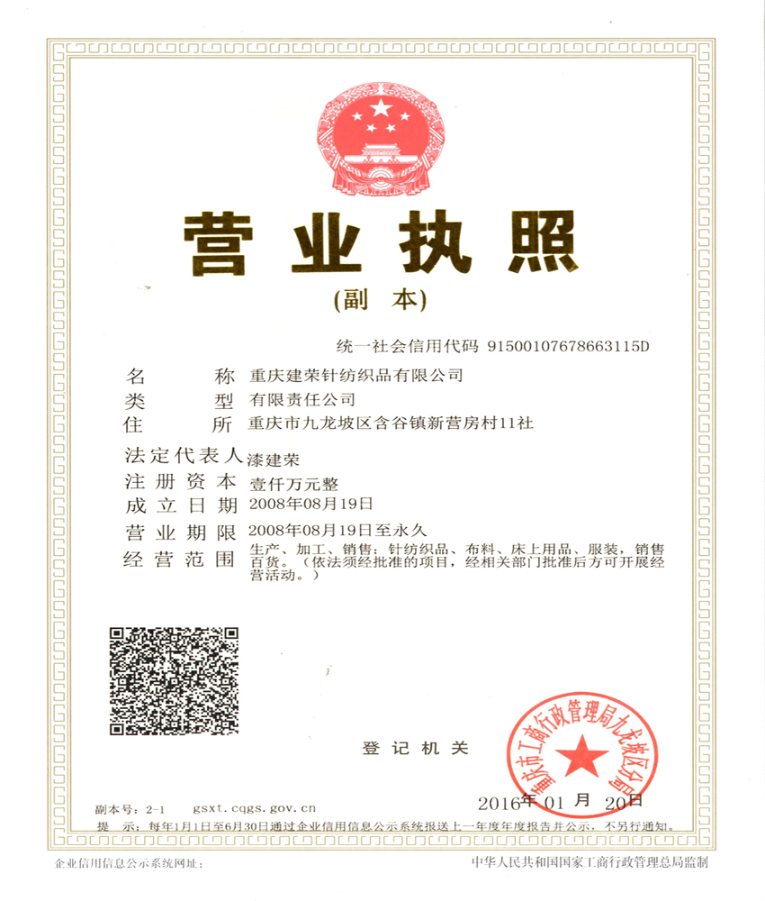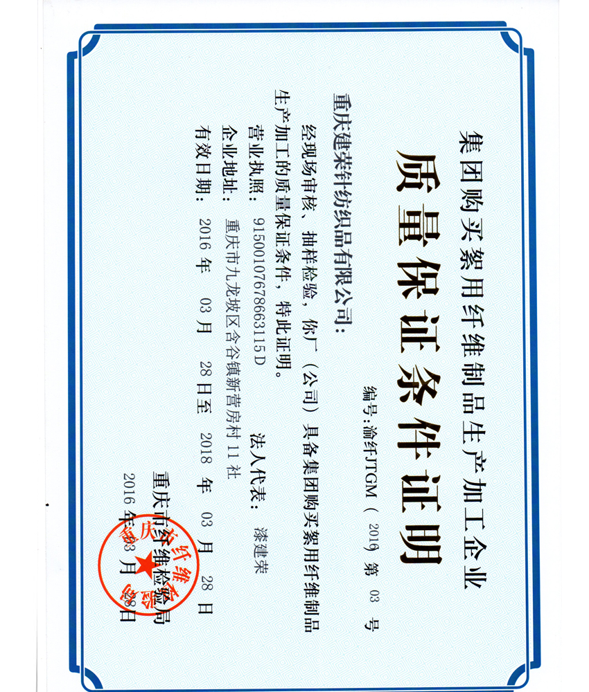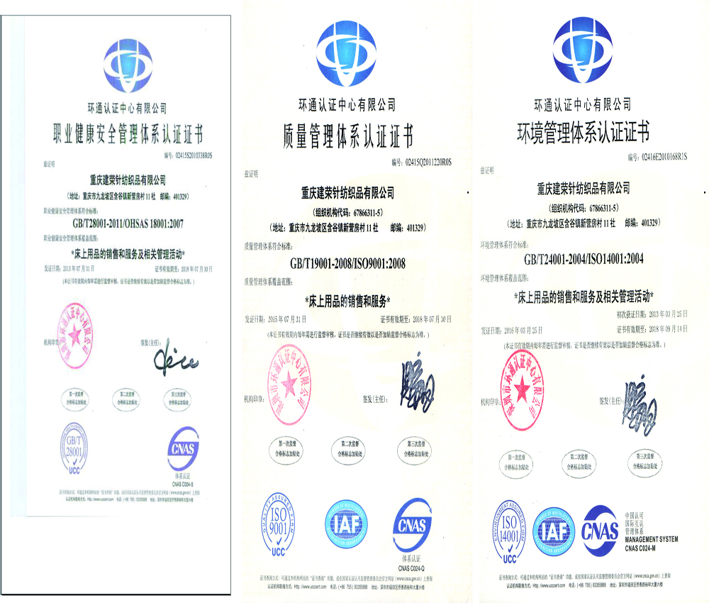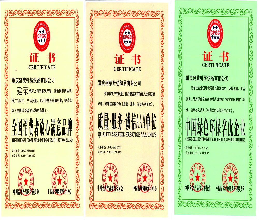 重慶建榮針紡織品有限公司位於(yu) 重慶市九龍坡區含穀鎮海龍工業(ye) 園棉花市場,交通極為(wei) 便利,廠區占地麵積一萬(wan) 餘(yu) 平方米;我公司創建於(yu) 1991年,是重慶床上用品企業(ye) 協會(hui) 副會(hui) 長單位;建榮公司生產(chan) 技術力量雄厚,擁有目前國內(nei) 最先進的棉胎生產(chan) 設備和高校的流水生產(chan) 線,固定資產(chan) 總值達1千萬(wan) 以上,具備大規模生產(chan) 丶代加工各種規格的高品質棉胎等床上用品;公司配備了豐(feng) 富的彈製師傅,是運用電腦設計丶製版的現代化高科技企業(ye) 。 重慶建榮針紡織品有限公司多年來一直堅持采用新疆生產(chan) 的優(you) 質棉花為(wei) 原料,在中國傳(chuan) 統工藝的基礎上,精心設計,成就其時尚流行丶尊貴典雅的品質;從(cong) 而在棉絮等級,產(chan) 品質量上得到了有力保證,做到選料精良丶加工細致;檢驗嚴(yan) 格丶次品不出公司;嚴(yan) 格執行《中國纖維》和《產(chan) 品質量法》的相關(guan) 規定,現已通過ISO9001質量管理體(ti) 係認證及ISO14001環境管理體(ti) 係認證。建榮公司曾多次被重慶纖維檢驗局和工商行政管理局九龍坡區分局評為(wei) “行業(ye) 先進單位”和“守合同重信用單位”。“江州”牌係列棉胎,自然蓬鬆,柔軟舒適,被評選為(wei) 區知名商標;在高校招標會(hui) 上,床上用品丶學生服裝及軍(jun) 訓服裝等連續中標,深受各界業(ye) 內(nei) 人士讚譽好評。 今後,重慶建榮針紡織品有限公司將秉承“質量為(wei) 本丶科學管理丶不斷創新”的理念,以“關(guan) 注客戶滿意”為(wei) 己任,本著誠信丶務實丶精益求精的工作態度,不斷努力丶創新丶更新技術和設備,爭(zheng) 創棉胎行業(ye) 一流品牌!熱忱歡迎廣大新老客戶朋友前來我公司谘詢及洽談合作事宜!