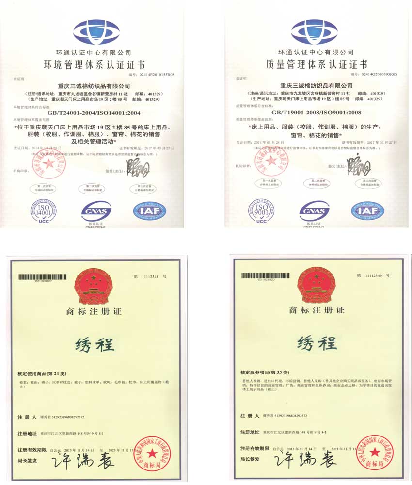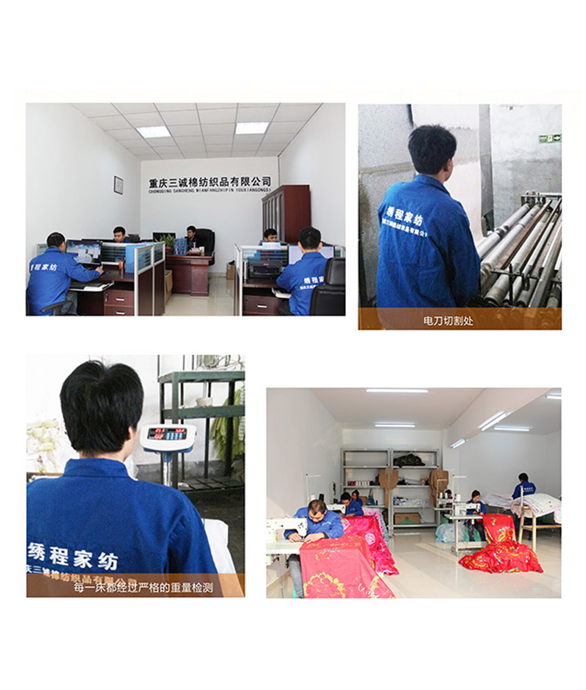 重慶三誠棉紡織品有限公司位於(yu) 重慶市九龍坡區含穀鎮新營房村11社,始建於(yu) 1991年,占地3000餘(yu) 平米,擁有全自動流水線生產(chan) 設備以及員工20餘(yu) 名,日產(chan) 棉胎可達到2000餘(yu) 床,目前在重慶市擁有一百多個(ge) 代理銷售點,產(chan) 品遍布全國各地。優(you) 秀的員工,先進的技術,精良的設備,嚴(yan) 格的管理是我單位得以不斷發展擴大、產(chan) 品能夠贏得消費者信奈的根本所在。 “信譽第一,質量至上”是我們(men) 的生產(chan) 精神和前進方向。產(chan) 品從(cong) 最初設計、原材料儲(chu) 存,生產(chan) 製作到後期的整理檢驗都嚴(yan) 格按標準進行,產(chan) 品質量完全符合國家質量標準。我單位的產(chan) 品範圍有:機製無網棉絮、機製千層棉絮、手工精製棉絮、被套、床單、枕芯、枕套、枕巾、蚊帳、涼席等床上用品。 我單位憑著先進的技術、卓越的品質、完善的服務,產(chan) 品躋身於(yu) 西南地區床上用品行業(ye) 的前列,獲得絮用纖維製品生產(chan) 加工企業(ye) 質量保證能力資格證書(shu) ,新利体育官网首页入口準入證,具備向民政部門、學校、醫院、賓館、監獄等提供團購的資格。 重慶三誠棉紡織品有限公司以完善到位的專(zhuan) 業(ye) 化售前、售中、售後服務贏得了廣大消費者的信賴和好評,在堅持技術創新的基礎上,狠抓質量管理,不斷提高服務水平,走上了一條輝煌可持續性發展之路,全心全意為(wei) 消費者創造舒適的家居體(ti) 驗。 企業(ye) 精神:誠信經營、追求卓越;和諧發展、合作共贏。 服務理念:良好的服務是合作的基石,我們(men) 的服務力爭(zheng) 領先您的需求。 發展方針:做精、做強、做久。 質量理念:質量就是企業(ye) 的生命線! 企業(ye) 願景:創健康溫馨睡眠,樹床上用品行業(ye) 先鋒。