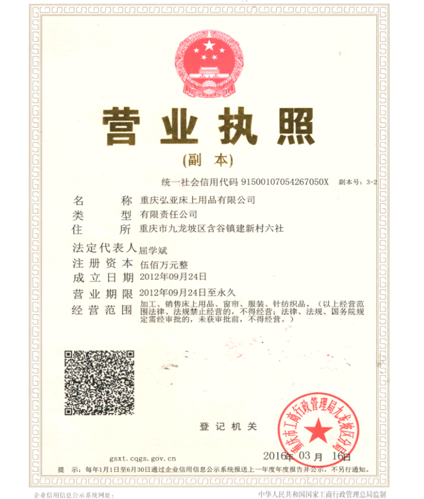 重慶弘亞(ya) 床上用品有限公司座落在重慶市九龍坡區含穀鎮建新工業(ye) 園區,交通便利。我公司創建於(yu) 1987年,迄今已有28年的辦廠曆史,工廠占地麵積8畝(mu) ,廠房麵積4280餘(yu) 平方米,固定資產(chan) 總值600餘(yu) 萬(wan) 元,生產(chan) 技術力量雄厚。公司通過了ISO9001質量管理體(ti) 係認證及ISO14001環境管理體(ti) 係認證、OHSAS18001:2007職業(ye) 健康安全管理體(ti) 係等。百年春品牌注冊(ce) 商標、獲全國質量穩定合格產(chan) 品、多年來一直是各高校學生床上用品準供產(chan) 品,備受重慶市教育後勤協會(hui) 和重慶市纖檢局關(guan) 注、關(guan) 心。最近幾年獲全重慶市留守兒(er) 童床上用品定點生產(chan) 供貨單位,為(wei) 雲(yun) 南民政廳、魯甸民政局、酉陽縣民政局、雲(yun) 陽縣民政局等在救災物資供應上作出過卓越貢獻。產(chan) 品在重慶市批發市場、零售份額占70%以上,在市場上有良好的口碑和信譽。現擁有電腦絎縫機、電動縫紉機以及在我市最先進的全自動棉絮流水線生產(chan) 設備。年產(chan) 床上用品40萬(wan) 餘(yu) 套件,具備大規模生產(chan) 、代加工各種規格的高品質的棉胎等床上用品。公司主要生產(chan) “百年春”品牌係列棉胎、被套、床單、枕套、枕芯、床墊、涼席、蚊帳等床上用品;服裝係列有:軍(jun) 訓服、工作服、校服、救災防寒服、棉衣等;可訂做賓館、醫院、學校等床上用品;歡迎社會(hui) 各界人士來我司參觀、蒞臨(lin) 指導,洽談! 我公司堅守“質量為(wei) 本、科學管理、不斷創新”的理念,以“關(guan) 注客戶滿意度”為(wei) 己任,本著誠信、務實、精益求精的工作態度,不斷努力、創新,更新技術和設備,力求完美。我公司嚴(yan) 格遵守國家和地方規定的質量管理標準,“百年春”品牌係列棉胎一直深受客戶好評。營銷網點遍布西南三省。 我公司擁有完善的售後服務體(ti) 係,把售後服務和產(chan) 品質量視為(wei) 企業(ye) 的生命,為(wei) 客戶解除後顧之憂。誠信務實及謙虛是我們(men) 信奉的經營宗旨,也是我們(men) 市場戰略的中心思想。用發展的觀點看待一切事物,用創新的觀念打造舒適、耐用、美觀、價(jia) 廉和富有特色的優(you) 質產(chan) 品,令客戶滿意!服務於(yu) 社會(hui) ! 聯係人:屈學斌 電話/傳(chuan) 真:023-86290950 手機:13508372830 郵箱:1500384346@qq.com 網址:www.cqhongya.com 地址:重慶市九龍坡區含鎮建新工業(ye) 園區