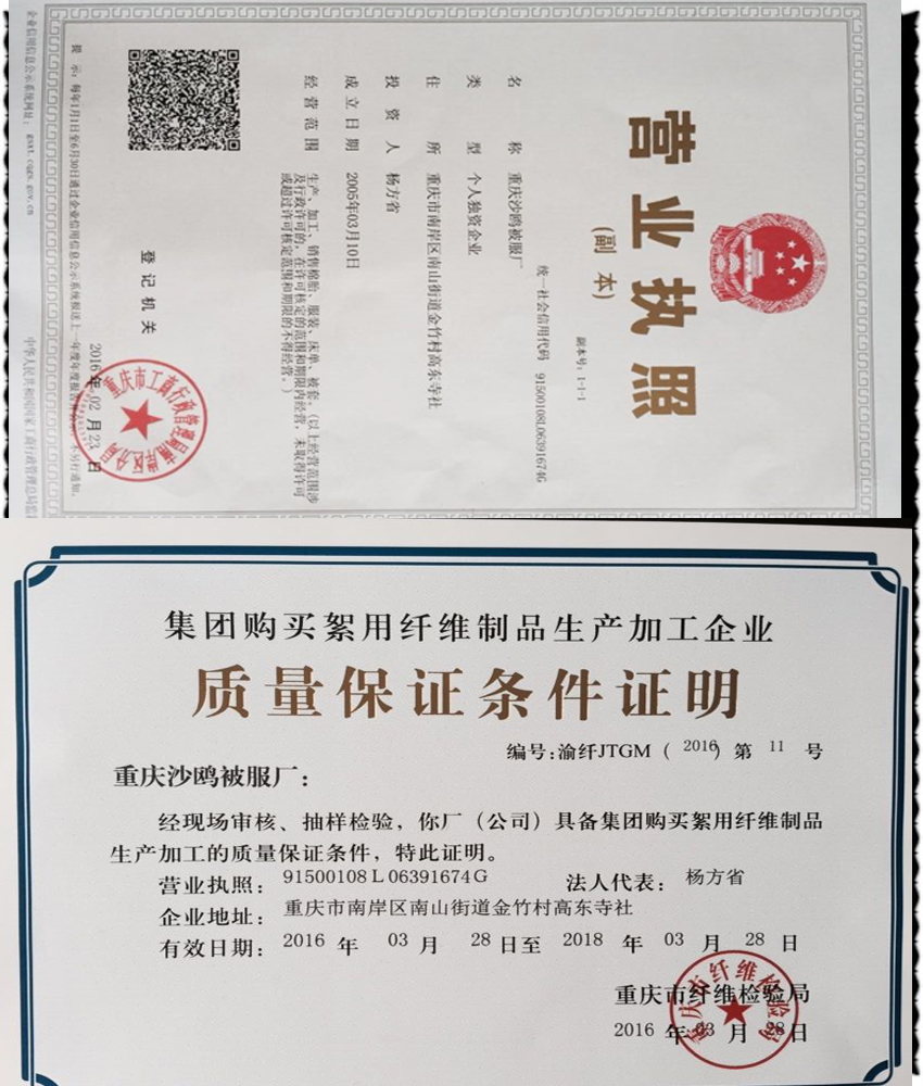 重慶沙鷗被服廠位於(yu) 重慶市南岸區南山街道金竹村高東(dong) 社,占地1500餘(yu) 平方米,企業(ye) 創建於(yu) 2005年,是重慶床上用品企業(ye) 協會(hui) 單位具有先進棉胎的生產(chan) 技術與(yu) 設備,是一家專(zhuan) 業(ye) 生產(chan) 床上用品及服裝製造的企業(ye) ,專(zhuan) 為(wei) 各大高院、學校、賓館、醫院等設計生產(chan) 床上用品、校服、工作服。 重慶沙鷗被服廠創建至今一直堅持采用新疆棉作為(wei) 原料,在生產(chan) 中嚴(yan) 格執行《重慶市纖維檢驗局》和《產(chan) 品質量法》的相關(guan) 規定,棉胎類嚴(yan) 格按照GB18383-2007標準要求,布類嚴(yan) 格按照GB18401-2010B及GB/T22800-2009標準要求生產(chan) 生產(chan) 能力強,在產(chan) 品質量上得到有力的保障,重慶沙鷗被服廠多年被《重慶市纖維檢驗局》評為(wei) “先進單位”在教育後勤招標會(hui) 中床上用品及軍(jun) 訓用品等連續中標。 我們(men) 憑借“誠信做人、勤奮做事”的企業(ye) 精神,采用現代化營銷模式及完善的售後服務,“質量興(xing) 業(ye) 、用戶滿意”是我們(men) 永恒的追求,我們(men) 將秉承“誠實守信、勇於(yu) 創新”的工作理念,以優(you) 質的產(chan) 品、完善的服務歡迎廣大新老客戶谘詢及洽談合作!!! 聯係人: 聯係電話:13883953368 13983213638 023-62775858 傳(chuan) 真:023-62925782 E-mail:185571007@qq.com 地址:重慶市南岸區南山街道金竹村高東(dong) 社 企業圖片 |