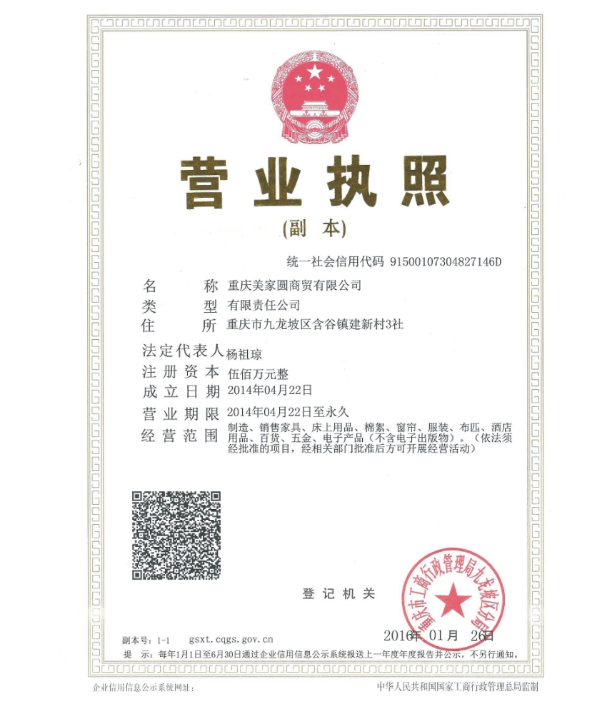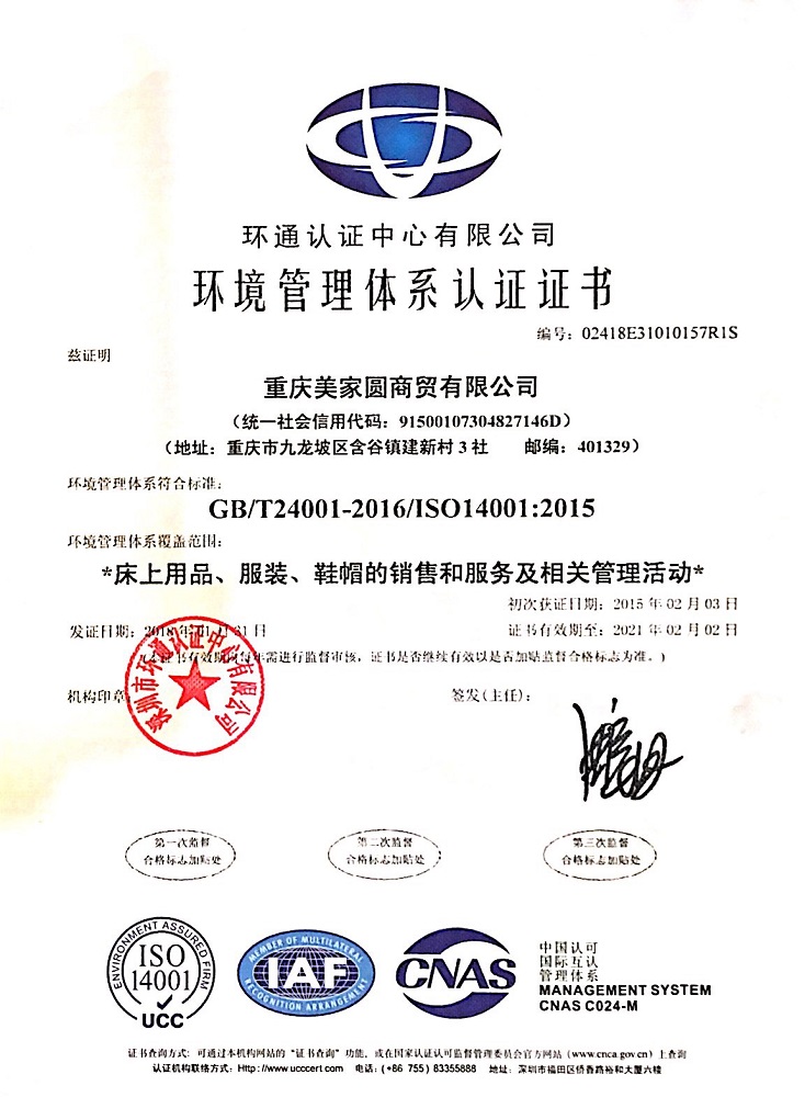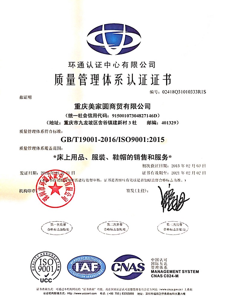 重慶美家圓商貿有限公司坐落在重慶市九龍坡區白市驛工業(ye) 園區,成立於(yu) 2014年。美家圓商貿是以一家有30年曆史是老企業(ye) 為(wei) 基礎,重組擴建而成。美家圓商貿成立以來,通過內(nei) 部的不斷完善與(yu) 對商機的把握,成為(wei) 了具備相當規模的床上用品生產(chan) 設計及銷售公司,並一直承擔多所大專(zhuan) 院校、醫院、賓館的設計供應商。美家圓商貿一直恪守“質量為(wei) 本,品牌經營,用戶至上”的宗旨。為(wei) 確保豐(feng) 采產(chan) 品的高品質,公司建立了完善的質量保證體(ti) 係(ISO9001:2008)、質量管理體(ti) 係(ISO14001:2004)和內(nei) 部管理機製,並獲得了重慶市纖檢頒發的絮用纖維生產(chan) 能力資格證書(shu) (名稱以纖檢所頒發的為(wei) 準)。並以嚴(yan) 格的質量標準、先進的管理模式、完善的監測設備與(yu) 技術、誠信為(wei) 本的經營理念、一流的員工隊伍為(wei) 保障,確保每一件送到客戶手上的產(chan) 品都令人稱心滿意。 公司現有員工30餘(yu) 名,其中獲得各級職稱及獲得各類獎項的設計人員10餘(yu) 名,大專(zhuan) 及以上各類專(zhuan) 業(ye) 人才20餘(yu) 名,是重慶市首批通過國家質量及生產(chan) 認證的企業(ye) 。目前,公司年銷售額達500萬(wan) 元,上繳利稅20於(yu) 萬(wan) 元。是重慶市實力最強的床上用品商貿公司之一,在重慶市乃至全國床上用品售行業(ye) 也有著較高知名度。 美家圓商貿是一家集新產(chan) 品研發、設計、生產(chan) 、銷售於(yu) 一體(ti) 的專(zhuan) 業(ye) 床上用品公司。我們(men) 的產(chan) 品包括:床單、被套、枕套、棉胎、枕芯、保護墊、冷氣被、羽絨被、絲(si) 棉胎、毛巾、台布、台裙、椅套、杯墊、客房易耗品、民用提花、印花床單、窗簾、窗紗、沙發布、床墊、服裝等。 本公司擁有床上用品廠和服裝廠大型廠房。床上用品廠擁有先進專(zhuan) 業(ye) 設備:被芯機、枕芯機、間棉機等生產(chan) 線,可訂做大專(zhuan) 院校、酒店賓館、行政機關(guan) 、醫院等企事業(ye) 單位的床上用品。 美家圓商貿誠歡迎海內(nei) 外客商來電來函,來樣定製,共同締造經典、完美、舒適的床上用品產(chan) 品,聯係電話:13708353265聯係人:楊祖瓊。 企業圖片 |
