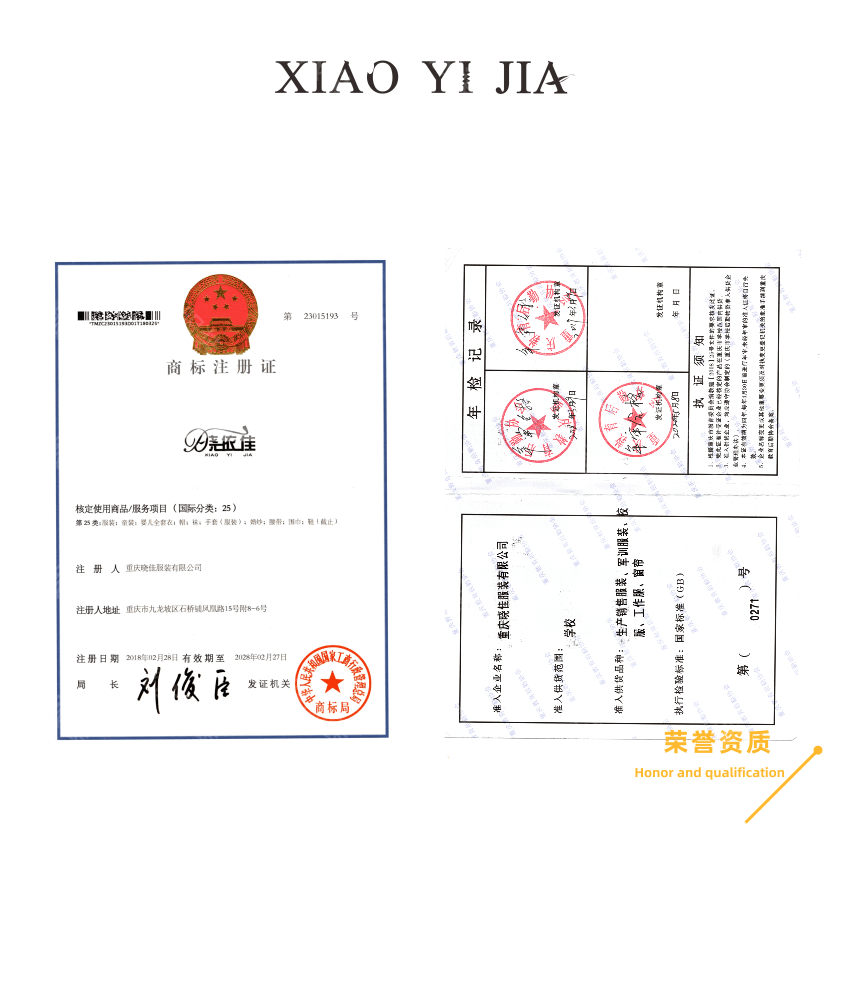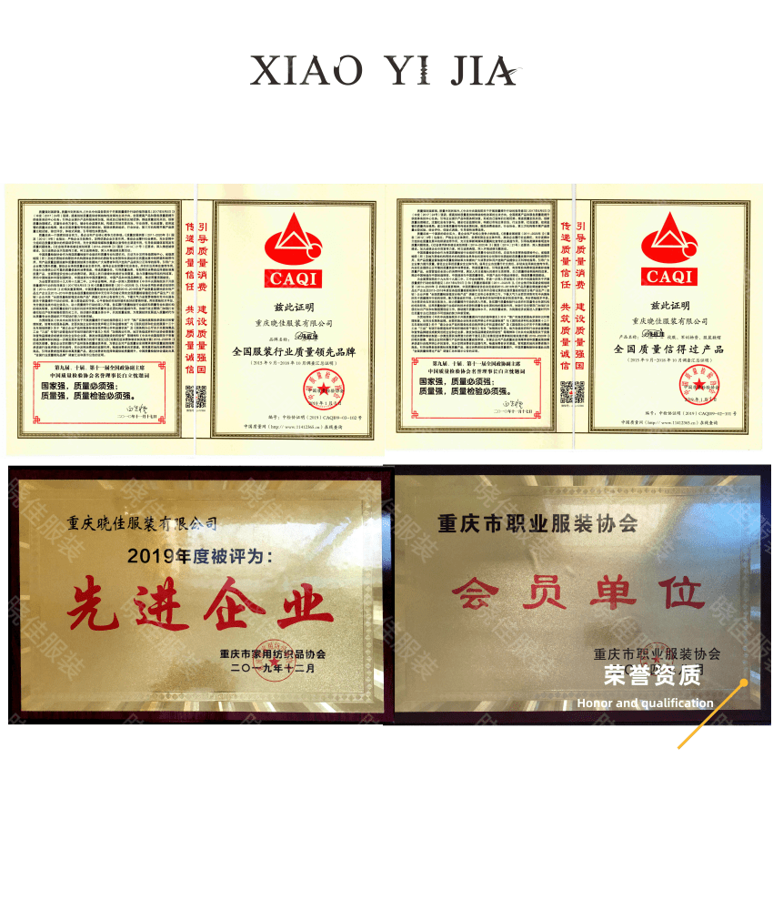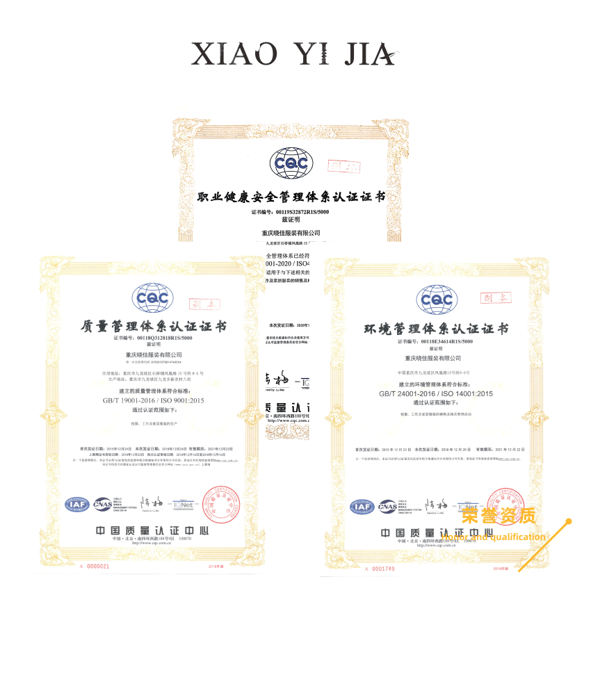 重慶曉佳服裝有限公司成立於(yu) 2001年,注冊(ce) 資金360萬(wan) 元人民幣,是一家擁有多年製作學生校服、學生軍(jun) 訓服、團體(ti) 服、工作服等的服裝企業(ye) 。公司位於(yu) 重慶市九龍坡區鳳凰路,廠房建築麵積1500平方米,環境優(you) 雅,交通便捷。 成立至今,公司一直秉承"質量至上、服務至上、誠信至上"的宗旨,目前已擁有先進生產(chan) 技術、一流生產(chan) 設備及出色的公司職工。逐步發展,公司年產(chan) 值持續突破數千萬(wan) 元人民幣,生產(chan) 各種工作服、廣告衫,年銷量200多萬(wan) 件,校服、軍(jun) 訓服5萬(wan) 多套, 醫生、護士服及家居服1萬(wan) 多套,贏得了眾(zhong) 多合作夥(huo) 伴的一致好評。公司在不斷提高完善現有產(chan) 品質量的同時,組建了高效、務實的顧問型研發團隊,緊跟市場新潮致力於(yu) 新產(chan) 品開發,滿足用戶的各種需要。 經過多年努力,公司逐漸確立了在服裝行業(ye) 的競爭(zheng) 優(you) 勢,公司早在2013就獲得了《重慶市新利体育官网首页入口物資供貨企業(ye) 準入證》,於(yu) 2012年通過了國家質量管理體(ti) 係認證:《GB/T19001-2015/ISO9001:2015,質量管理體(ti) 係認證證書(shu) 》:《GB/T24001-2016/ISO14001:2015 ,環境管理體(ti) 係認證證書(shu) 》:《OHSAS 18001:2007 GB/T28001-2011,職業(ye) 健康安全管理體(ti) 係認證證書(shu) 》。 我公司自有品牌“曉依佳”定製校服係列、定製團體(ti) 服係列、定製工作服係列等產(chan) 品為(wei) 全國各地幼兒(er) 園、中小學、高校、汽車摩托車生產(chan) 企業(ye) 、知名企業(ye) 等數萬(wan) 個(ge) 單位供貨,並建立了良好的合作關(guan) 係。 重慶曉佳服裝有限公司,定將不忘初心,牢記使命,將品質做好,將服務做好,將誠信做好。誠摯的歡迎各界領導、朋友蒞臨(lin) 公司指導工作、交流意見、洽談業(ye) 務。 聯係人:夏林 聯係電話:18623037733 開戶行:中國民生銀行股份有限公司重慶高新支行 賬號:1103014210018507 一般納稅人識別號:50090368147485X 辦公電話:023-68665503 傳(chuan) 真:023-68665503 郵 箱:604699183@qq.com 企業圖片 |