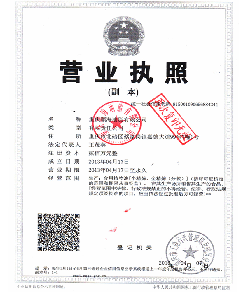 公司從(cong) 事油脂行業(ye) 長達20餘(yu) 年,是重慶隆全油脂公司和重慶興(xing) 隆油脂公司合並而來,並於(yu) 2013年正式更名為(wei) 重慶順海油脂有限公司,注冊(ce) 資金貳佰萬(wan) 元人民幣。