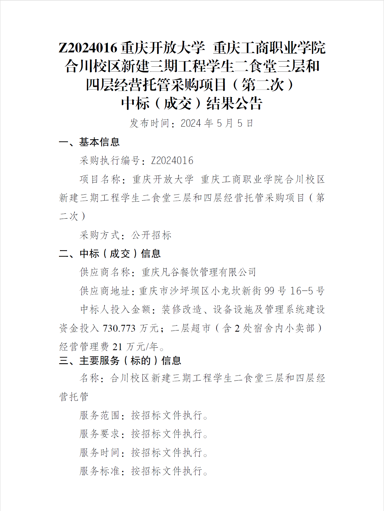 重慶開放大學 重慶工商職業學院合川校區新建三期工程學生二食堂三層和四層經營托管項